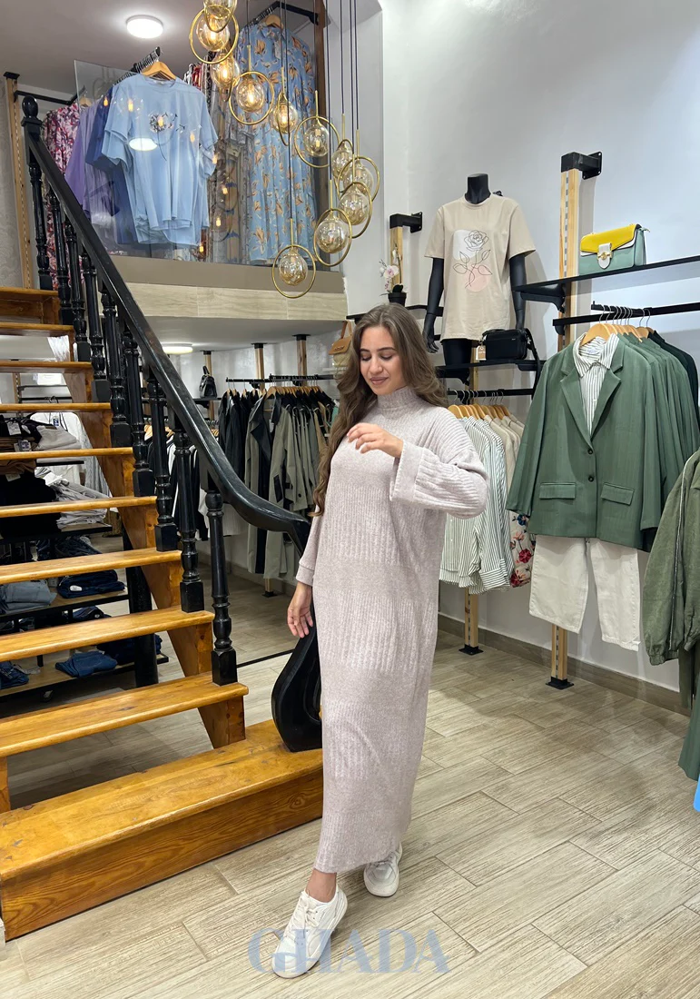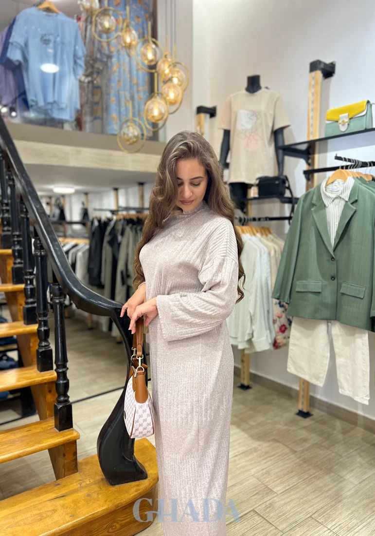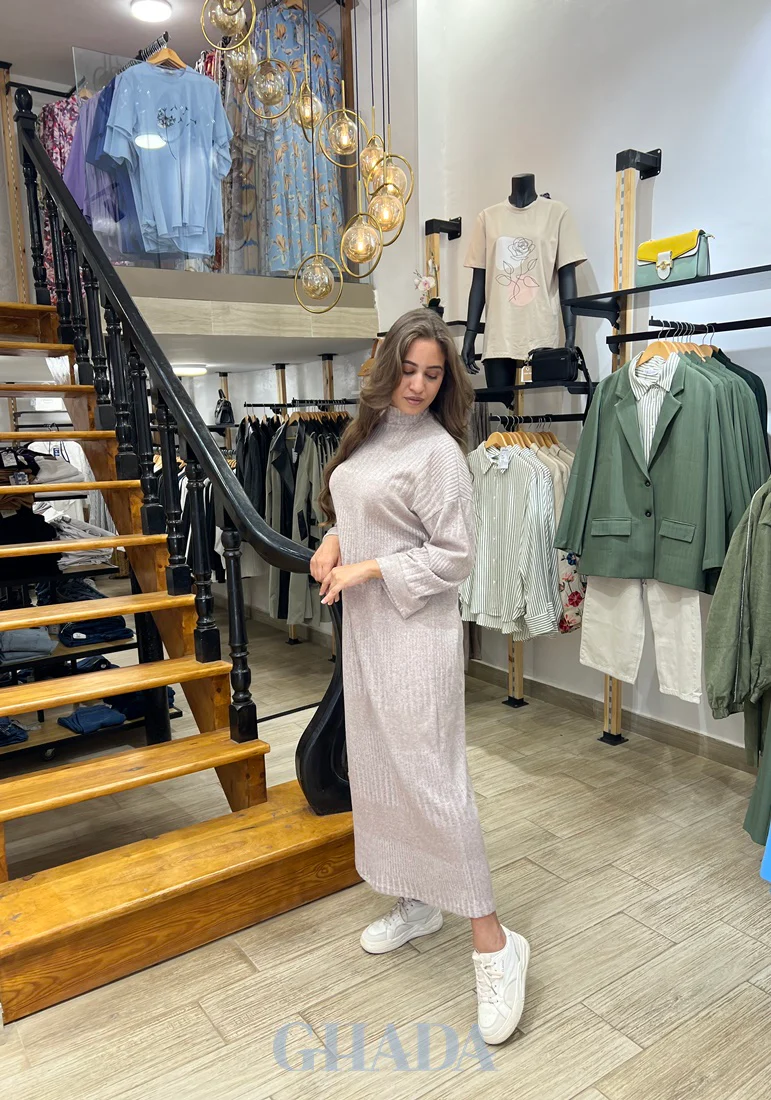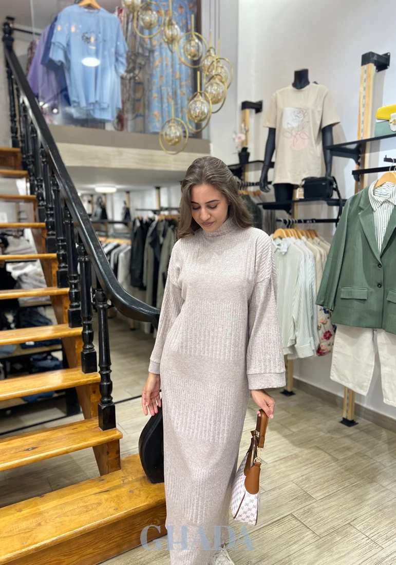 Ajoutez notre robe en maille chic en beige signée GHADA, à votre garde-robe.