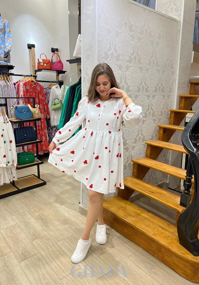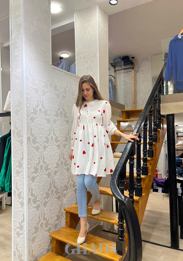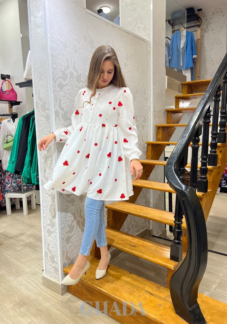 Explorez notre nouvelle collection printanière signée GHADA pour des tenues élégantes et une palette de couleurs diversifiée. Chemise longue blanche brodée en rouge d’un tissu lin de très bonne qualité. Fermeture par boutons sur le devant, avec un col rond, des manches longues et des petits poignets à boutons avec une découpe princesse. Mannequin porte […]