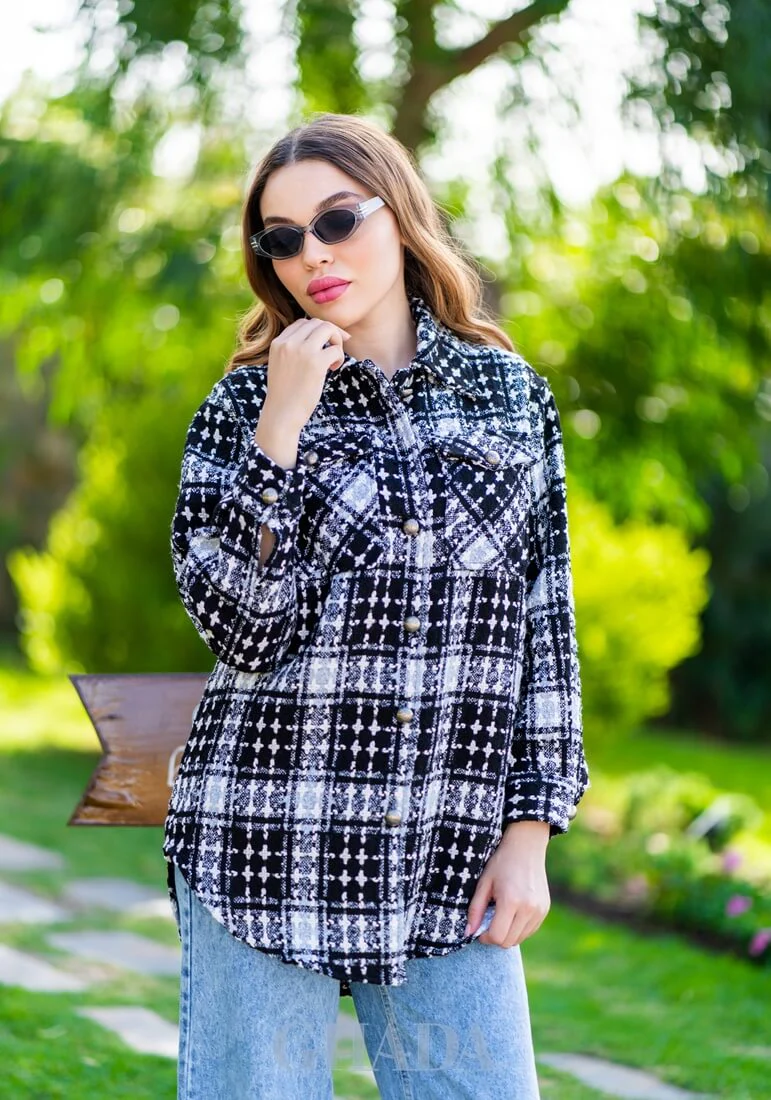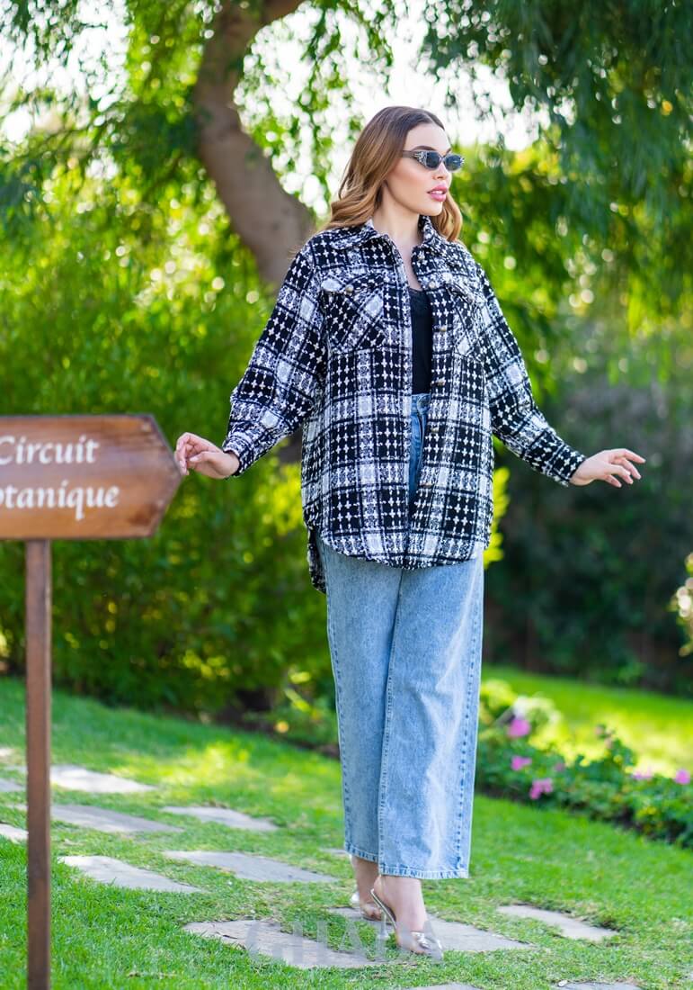 Surchemise à carreaux en blanc et noir avec des bouton métallisé sur le devant.