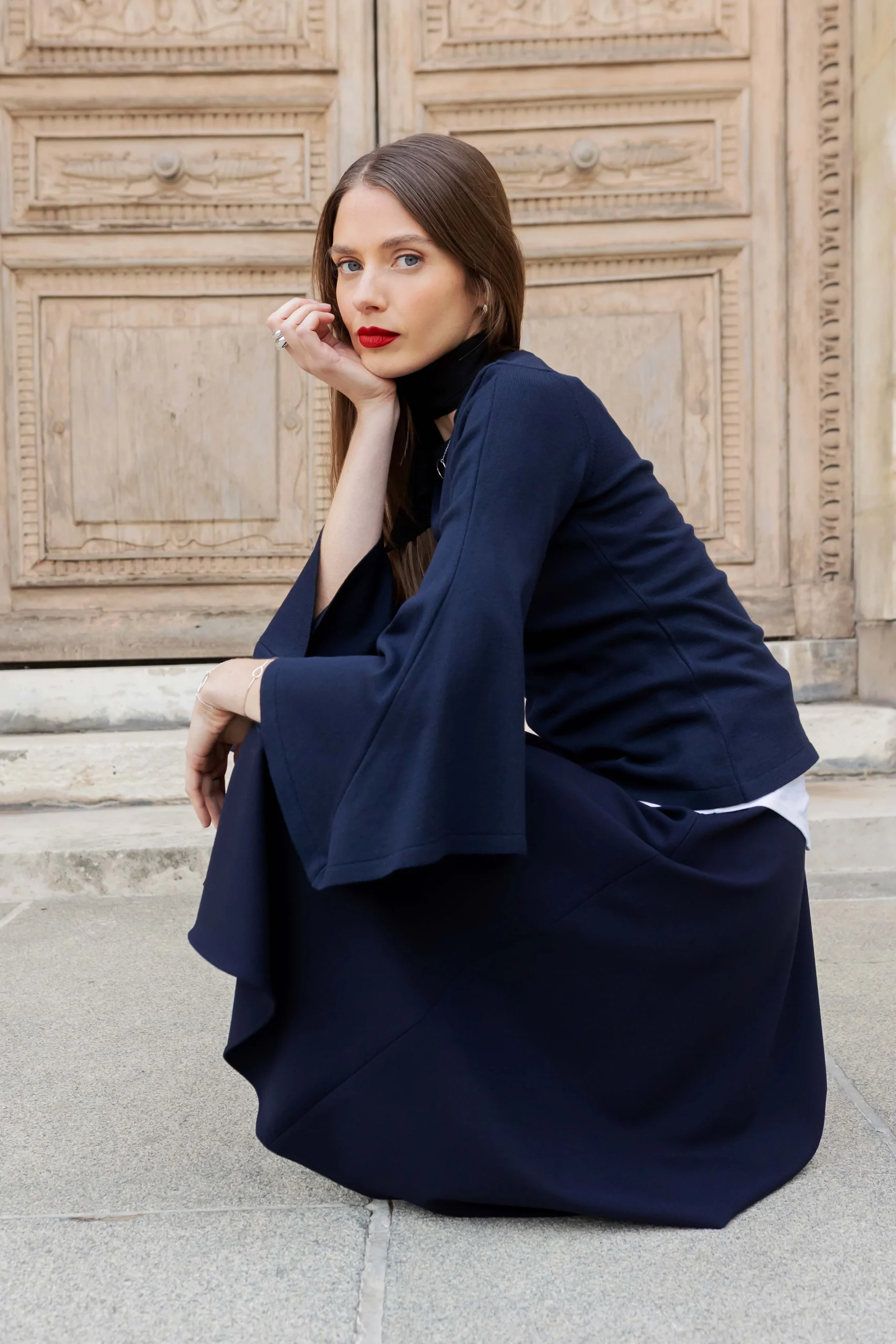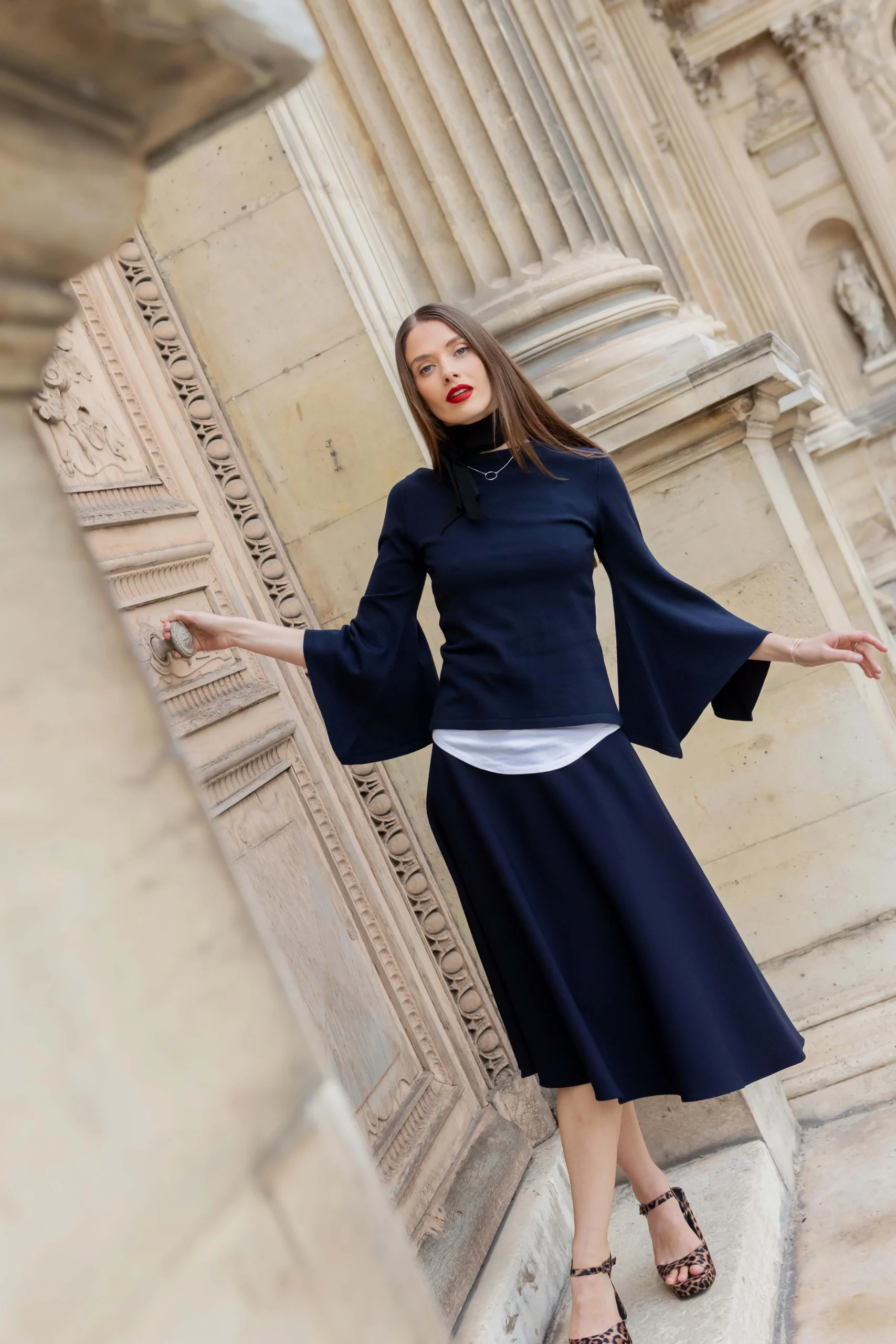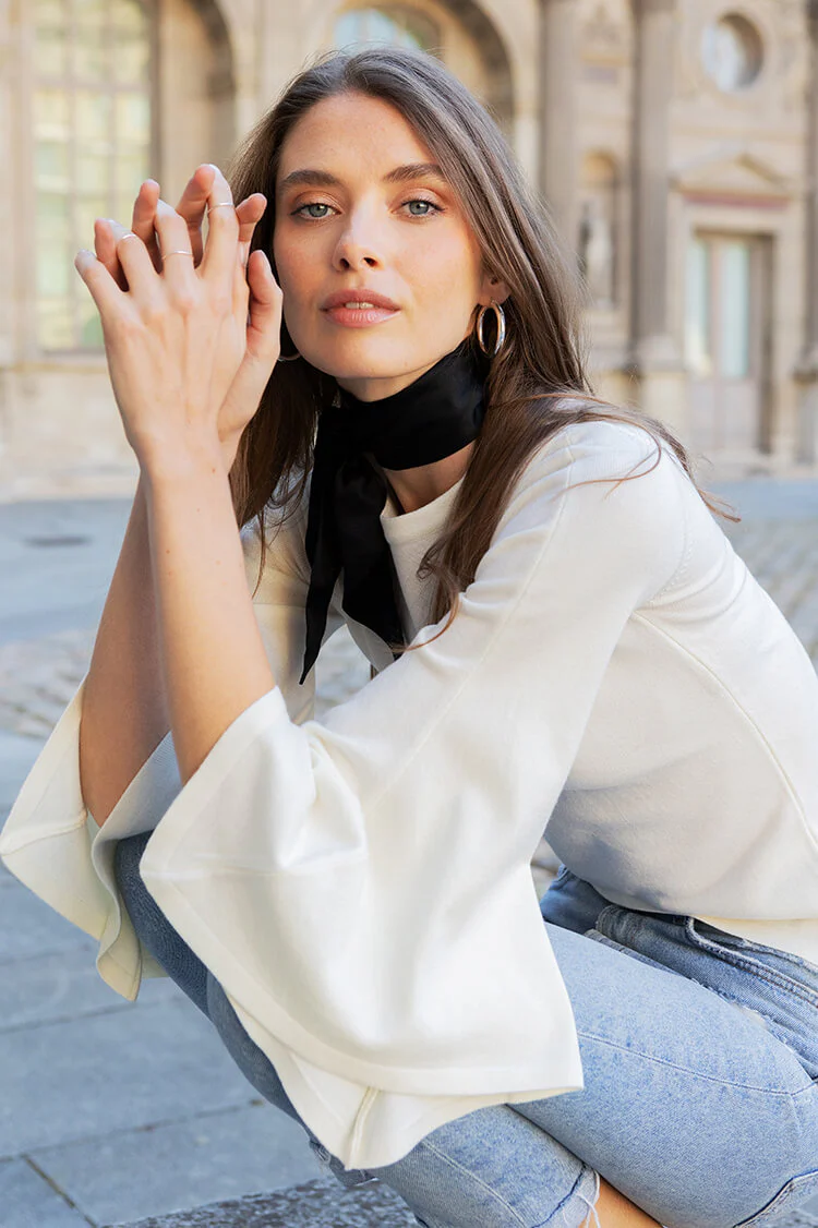 Er zeichnet sich durch einen klassischen Rundhalsausschnitt und elegante Trompetenärmel aus, die einen femininen Akzent setzen.