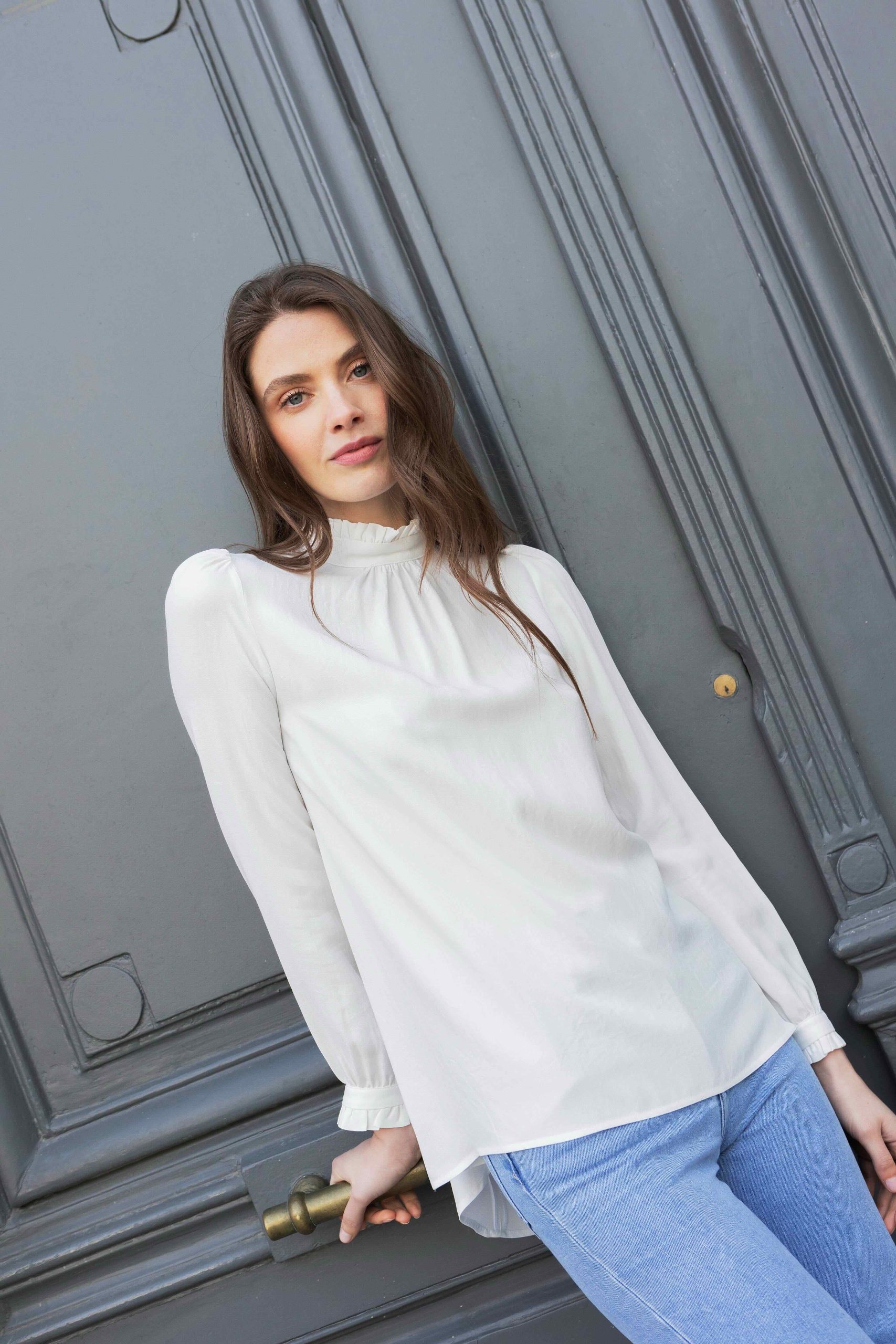 Dieses Oberteil können Sie zu jedem Anlass tragen.Es ist aus luftigem Crêpe gefertigt und hat eine tadellose Passform.Es hat einen leicht ausgestellten Schnitt und hübsche Rüschendetails an den Ärmeln und am Ausschnitt.Tragen Sie es am Abend zu einer schwarzen Hose und hochhackigen Sandalen oder tagsüber zu Jeans.Kleiner Tipp – Betonen Sie den Schmuckknopf, indem Sie Ihr […]