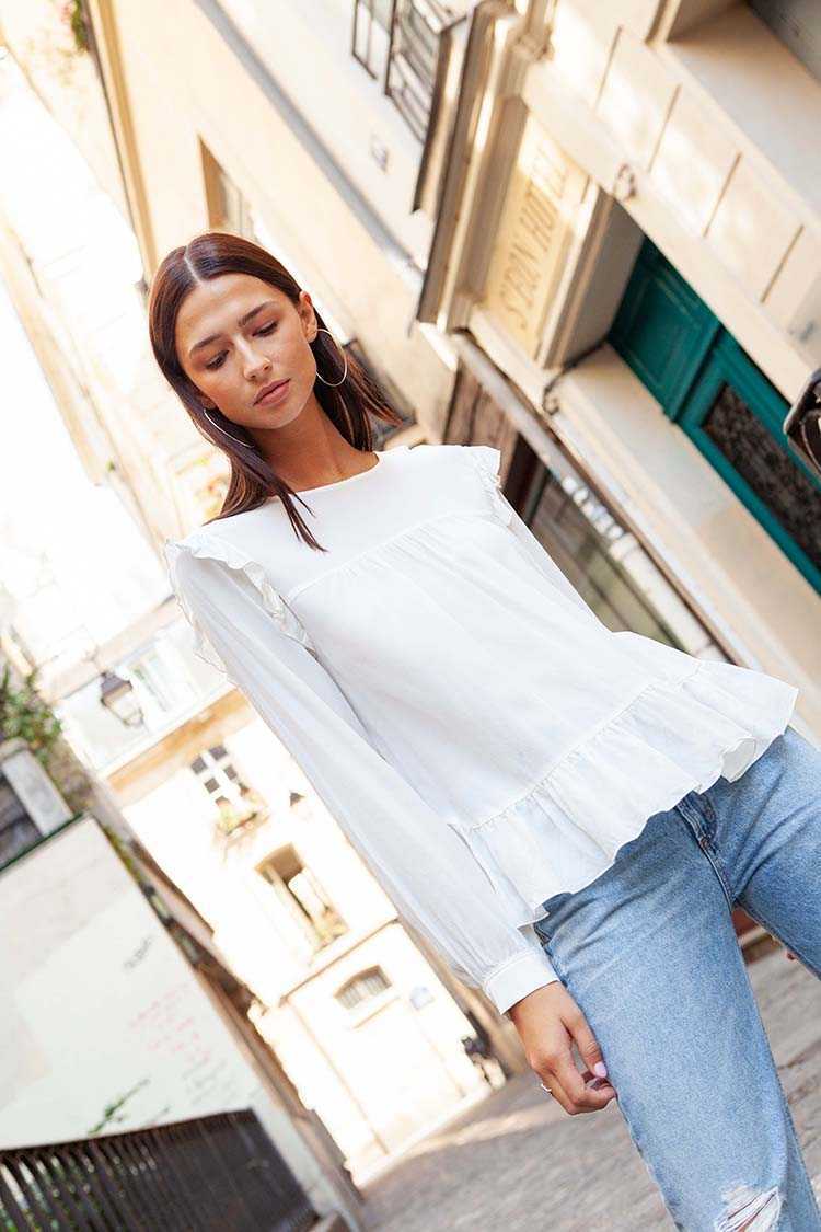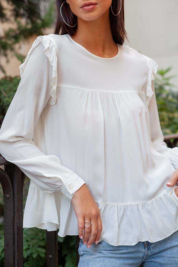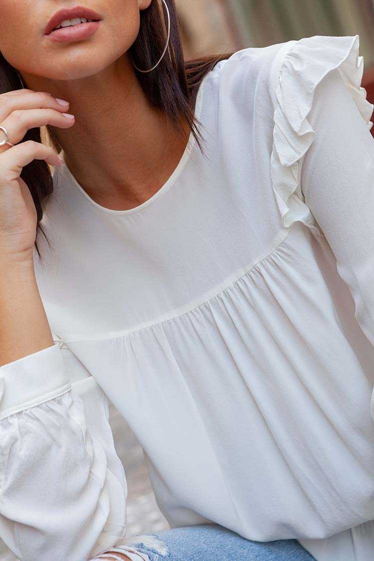 Top Lana creme. Retro-Bluse mit Rüschen an Schulteransatz und aufgereihten Falten an Passe sowie am Taillenbereich.