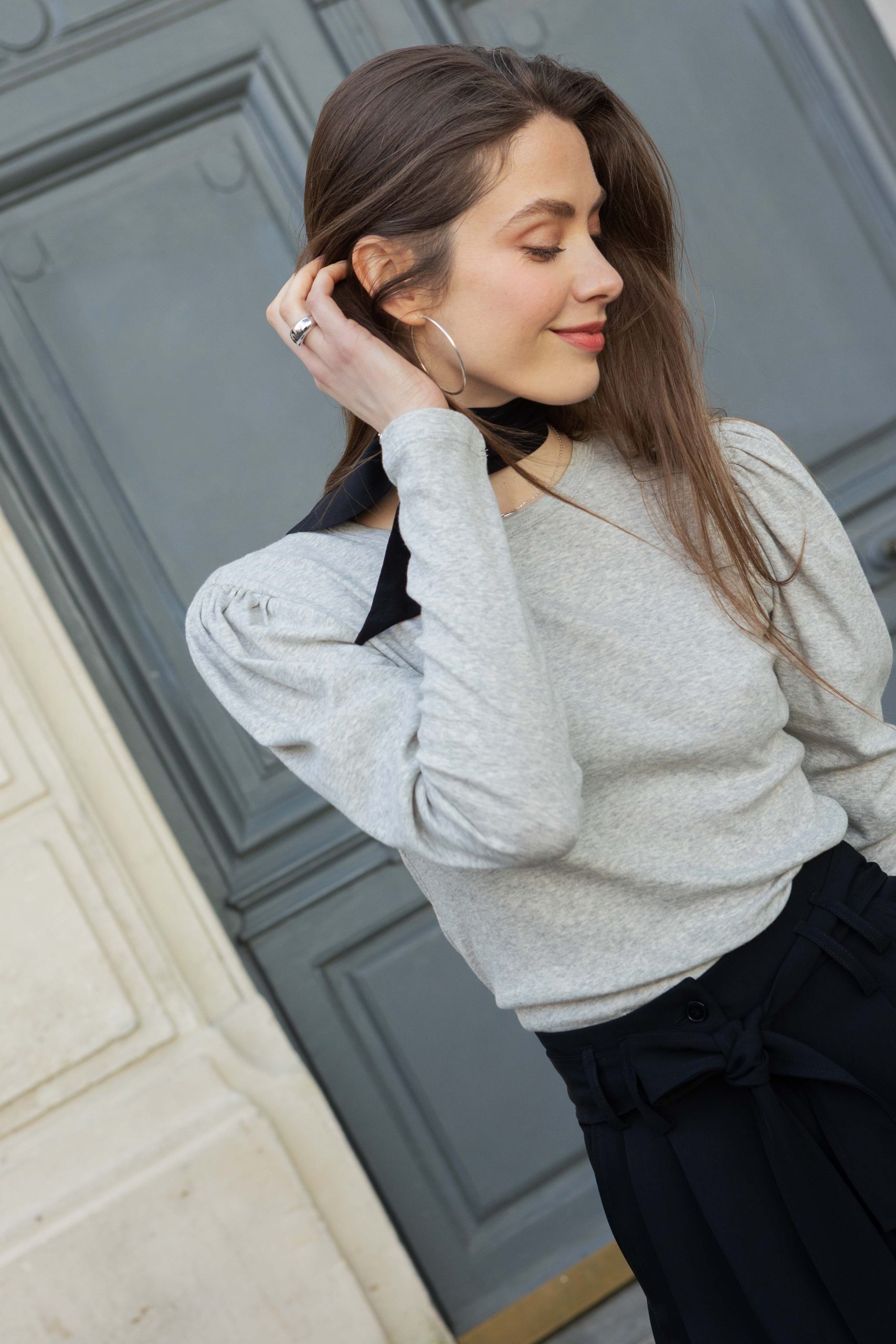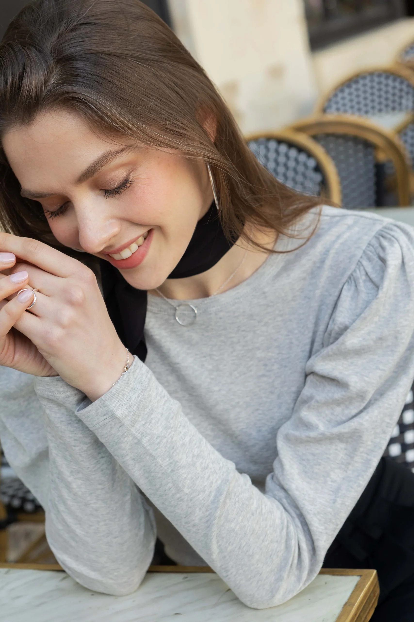 Gefertigt aus einem weichen, atmungsaktiven Material, überzeugt es mit dezent gepufften Schultern, die der Silhouette einen modernen und zugleich femininen Touch verleihen. Der klassische Rundhalsausschnitt und die langen Ärmel machen es zu einem stilvollen Begleiter für jede Jahreszeit.