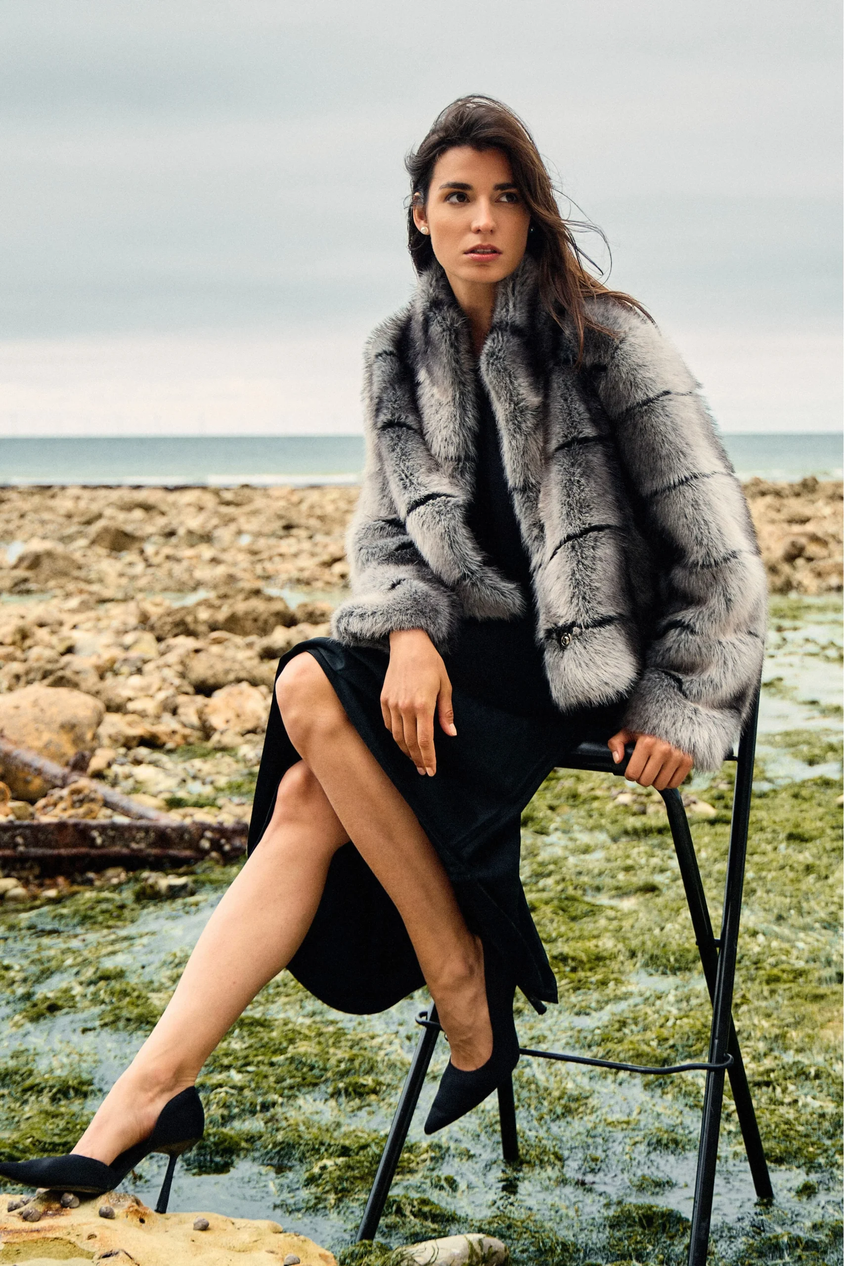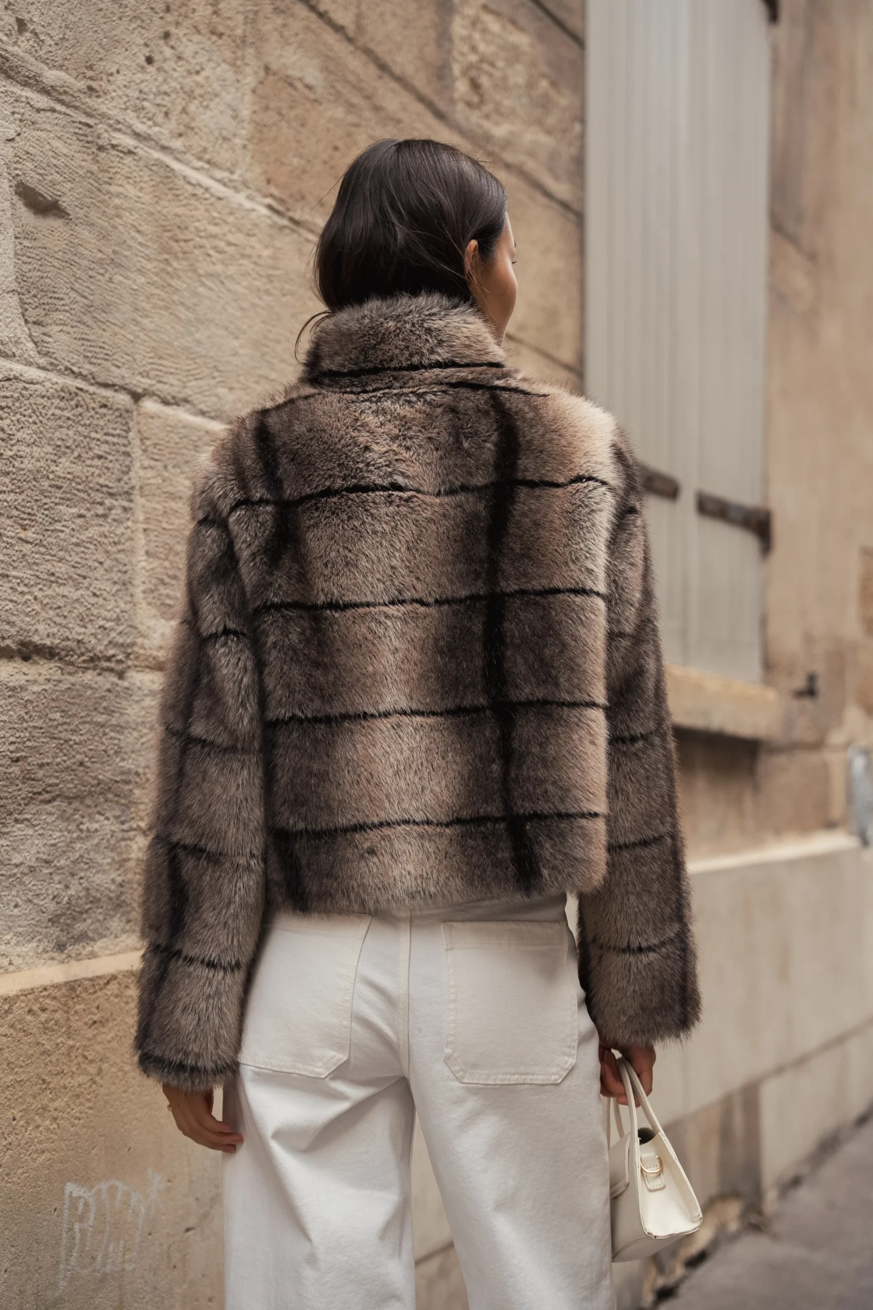 Blouson court en fausse fourrure Col montant Fermeture à boutons sur le devant Poches avant Notre mannequin mesure 177cm et porte une taille S