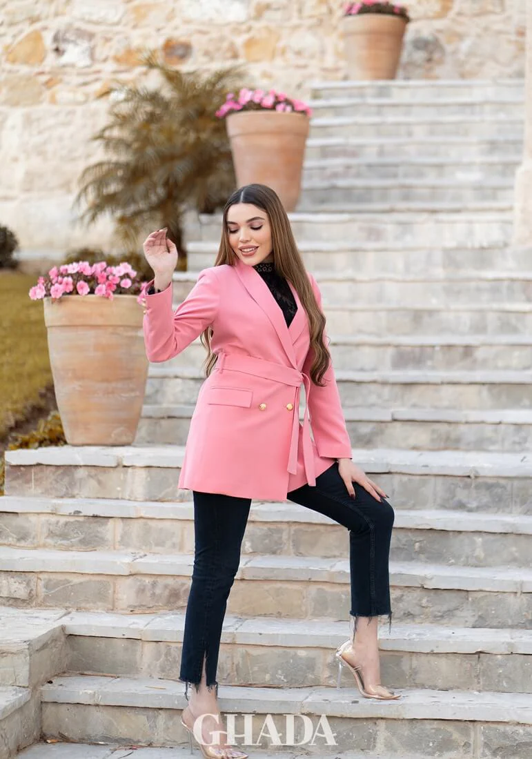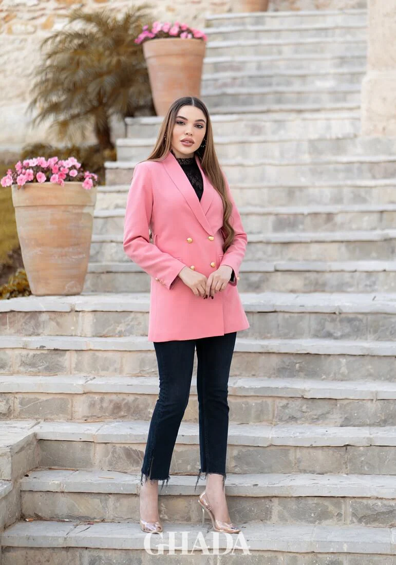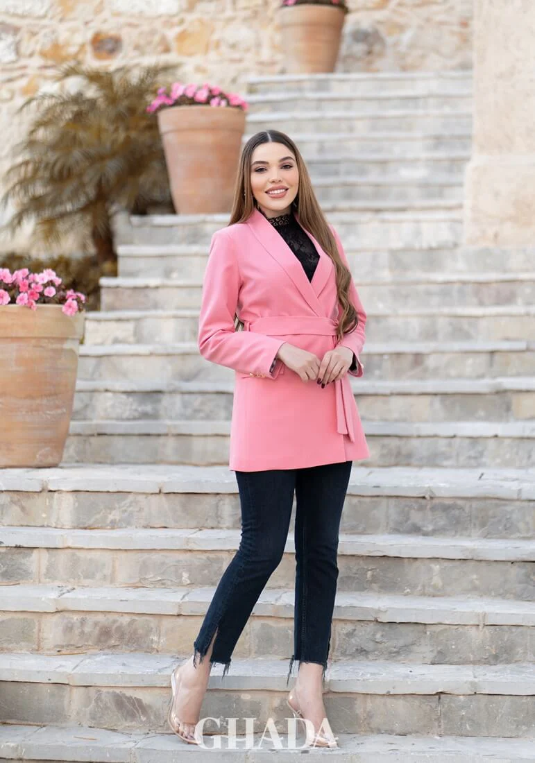 Veste col chal en rose.