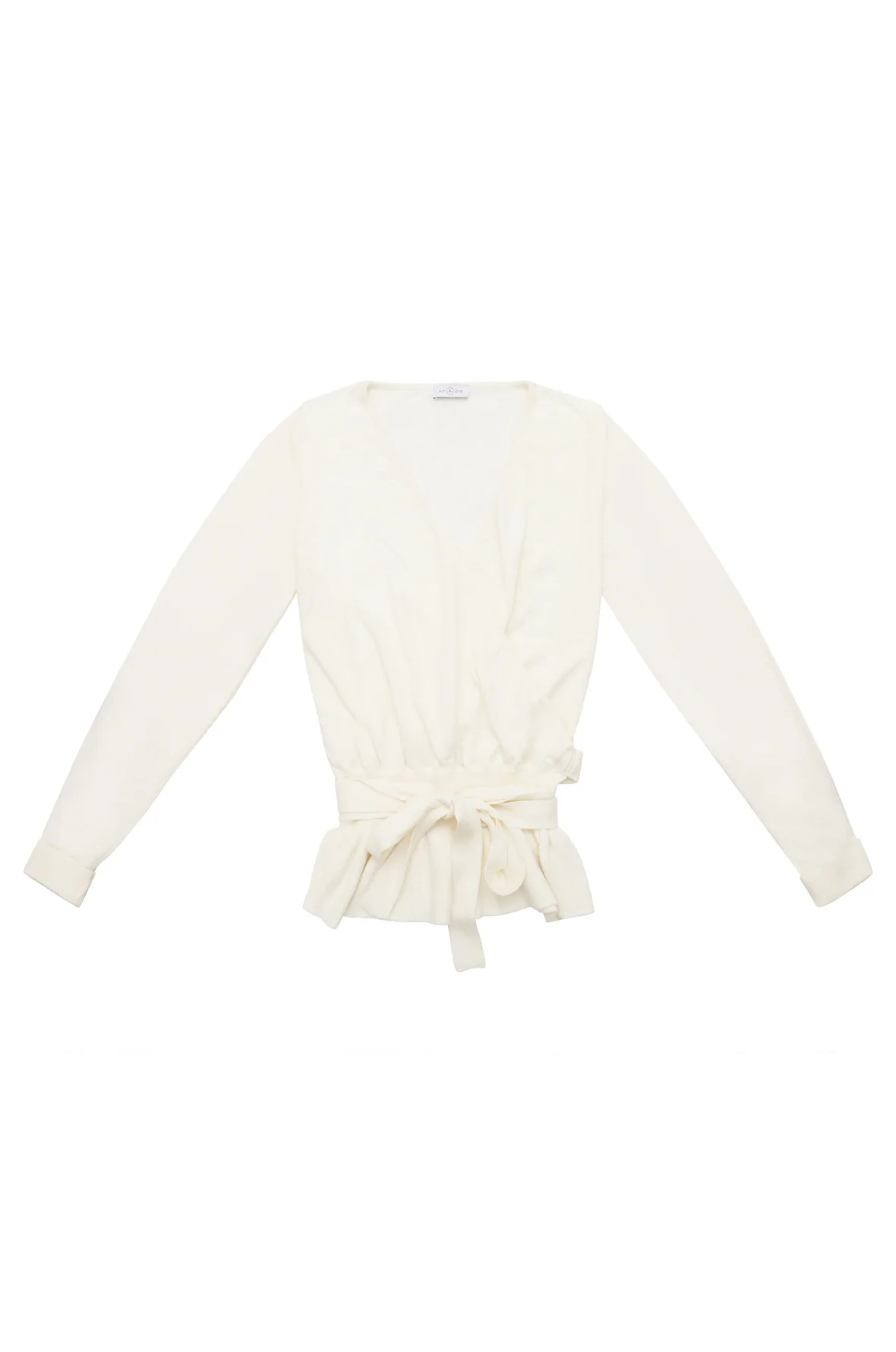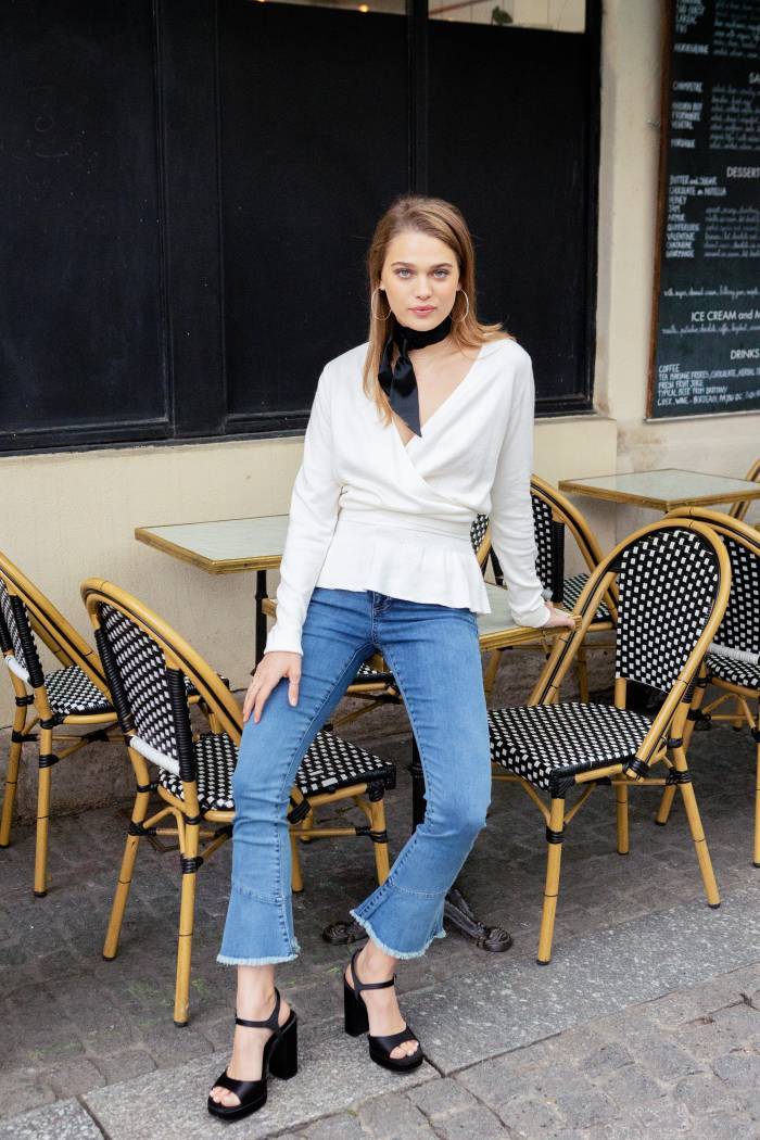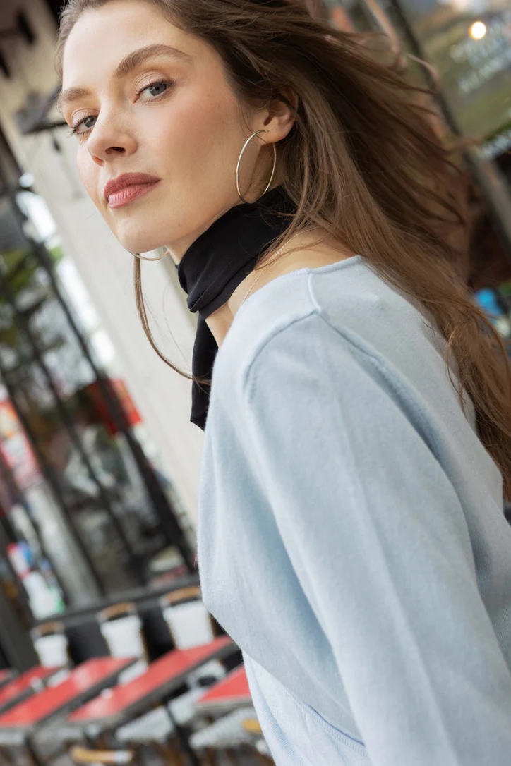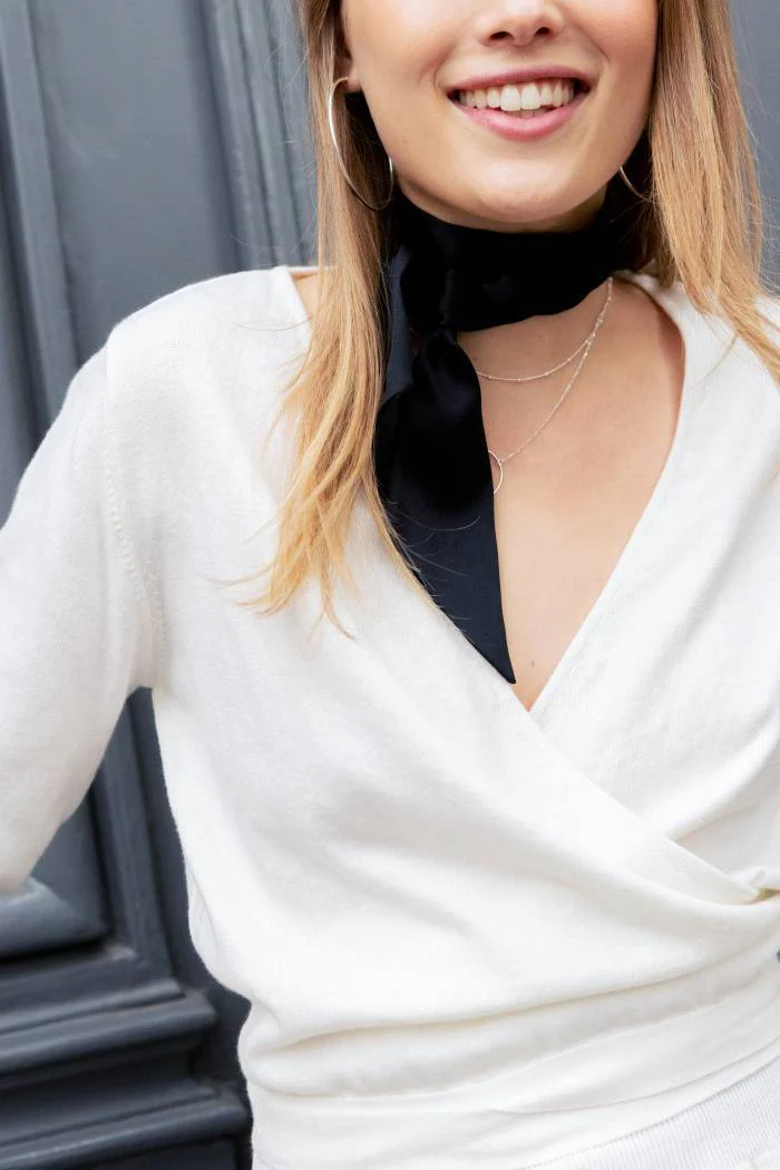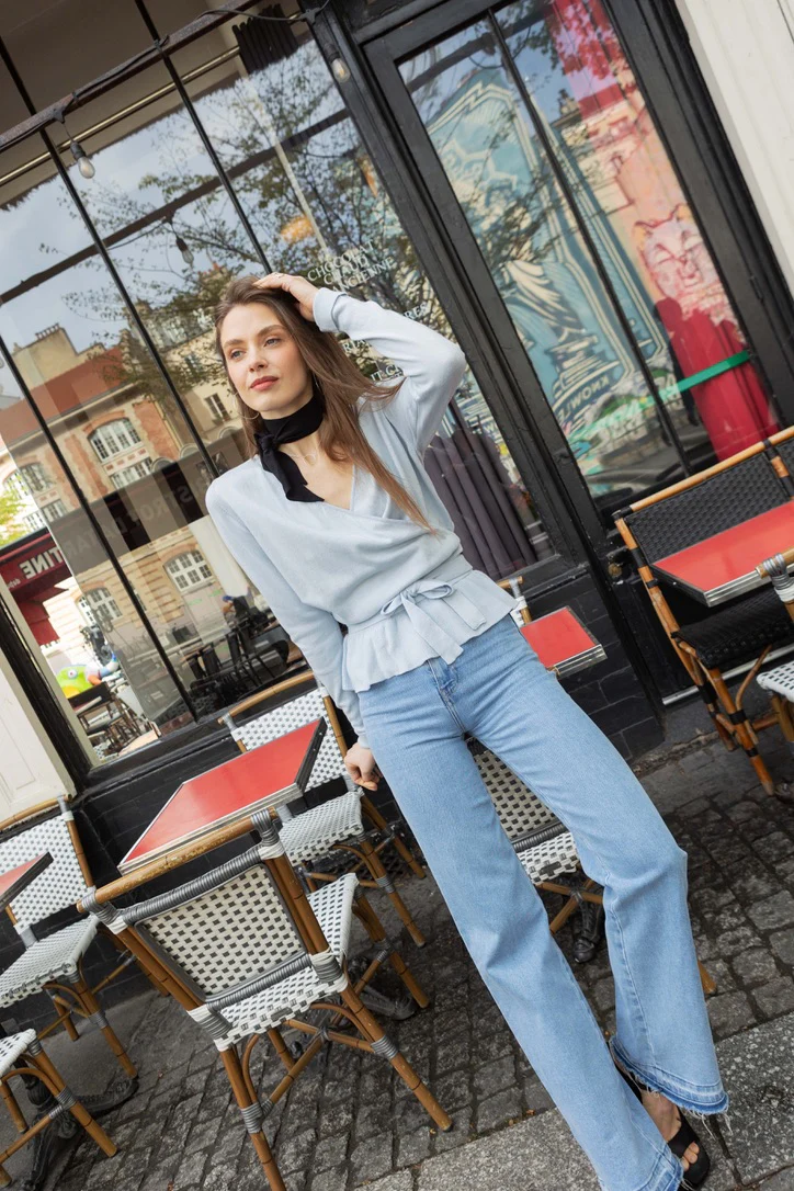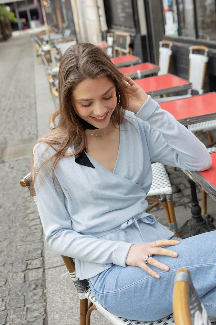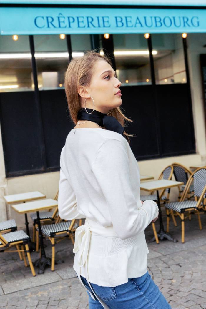 Dieses Modell, zugleich feminin und romantisch, zeichnet sich durch seinen zart gerafften Abschluss und den Bindegürtel an der Taille aus. Es wird aus einer weichen Mischung aus Baumwolle und Merinowolle gefertigt und passt perfekt zu einer modernen Jeans.